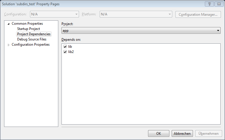 This will generate a solution file with the name subdirs.sln. When opening this file in MSVC2010 a solution will be opened that contain the three project: app, lib, and lib2. A compile on the solution will call compile for each of the contained projects.